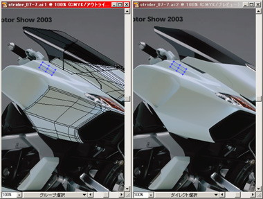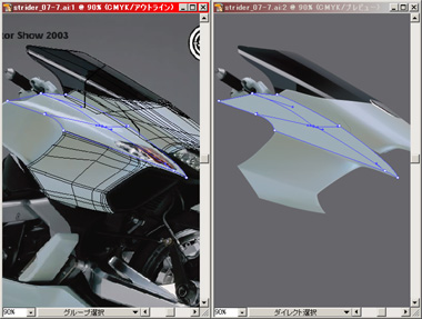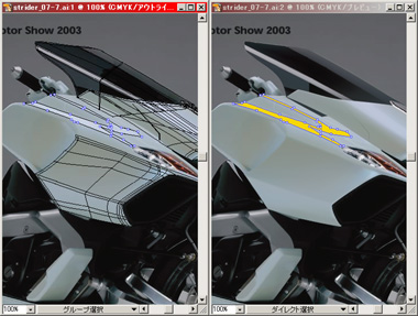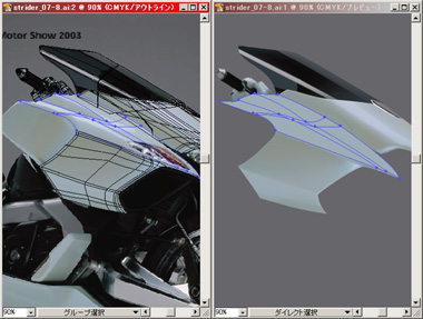 左) 「Z」型のハイライト(図中では別オブジェクト)をメッシュで描きこみます。