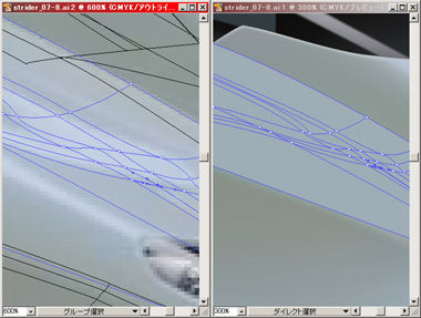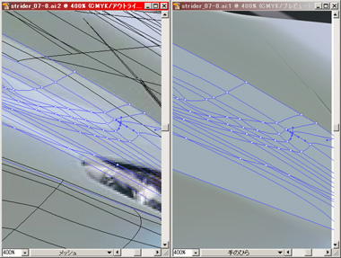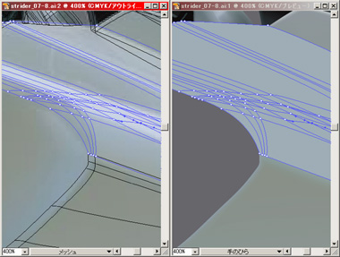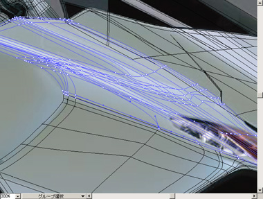 右) この部分の陰影箇所を矩形の 1辺にしてメッシュを流していきます。