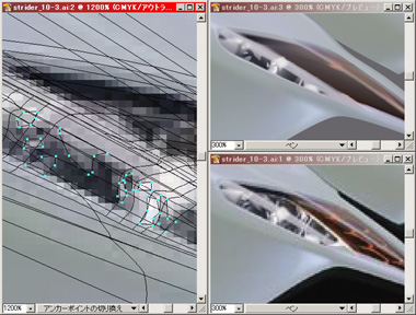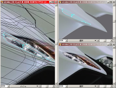 さらに右側にもパスでハイライトを描写して、中央部の大きなハイライトはメッシュで描きます。パスのグラデーション、ブレンド、メッシュを