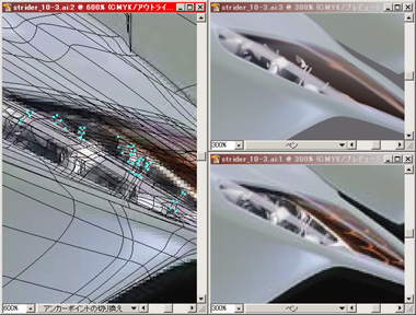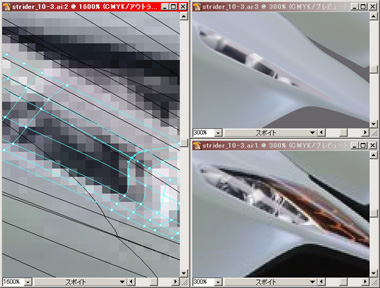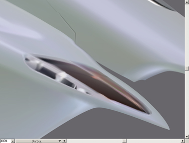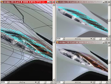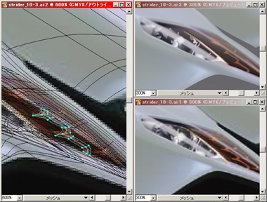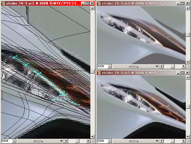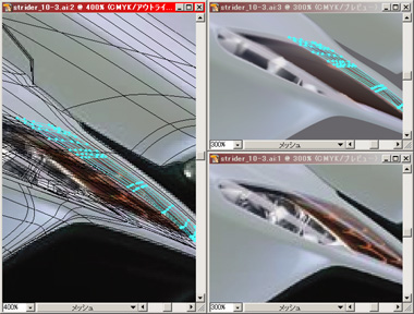 ここもメッシュでの重ね合わせです。描写中の拡大表示ではアラが出ますが、72dpiでの出力ならばそれほど目立たずに馴染みますね。