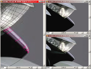 どちらも、今まで行ってきた矩形からの変形後に、色の境目にポイント追加・サンプリングです。