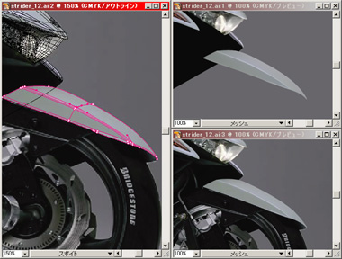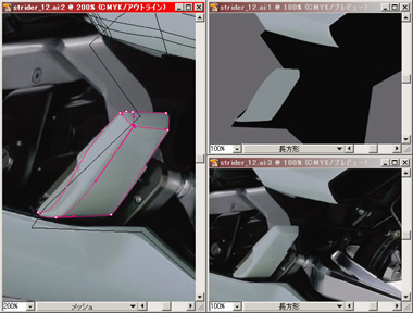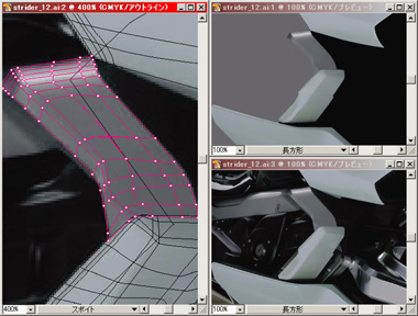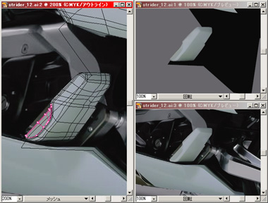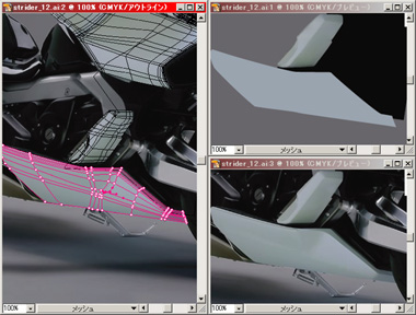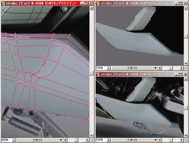 次はアンダーカウルです。ここも、一見複雑そうですが、わりとメッシュを流しやすい形状・陰影ですね。