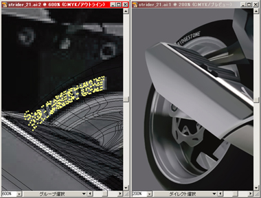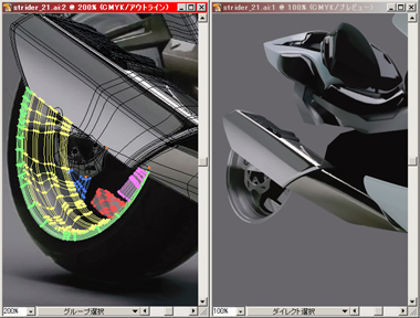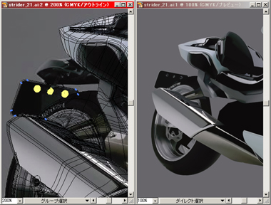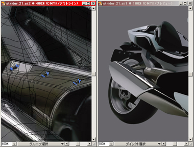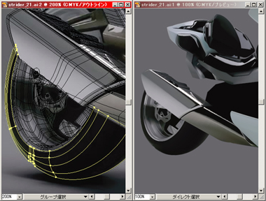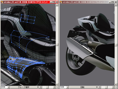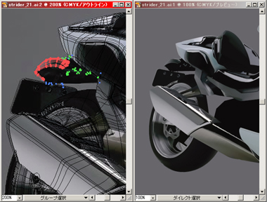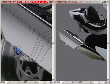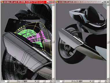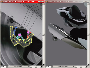 右) 赤で表示されている部分をメッシュで、その他は普通のパスで描いてリアフェンダーまで出来上がりました。
