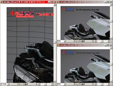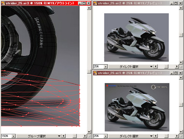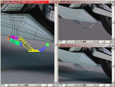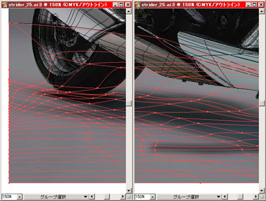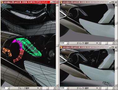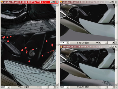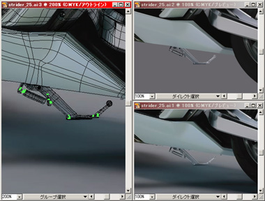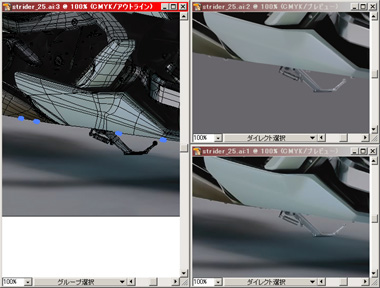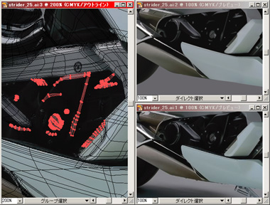 右) 次に、細かいボルト類の頭を普通のパスで描き加えます。