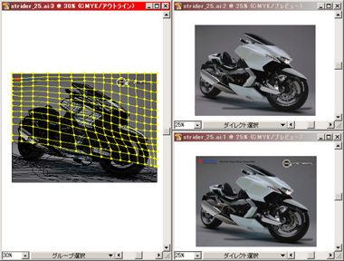 バイクの影に合わせてメッシュの流す方向を決めます。四つ角の配置は青丸で示した箇所にします。